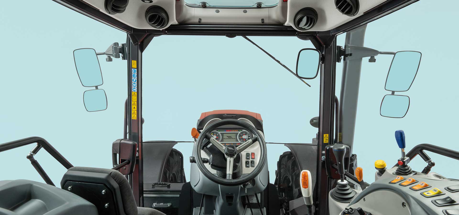 Premiere kabina s četiri stupa s otvorom na krovu koji se otvara i poklopcem motora koji je nagnut prema naprijed pružaju nesmetanu vidljivost u svim smjerovima. Operater radi udobno s intuitivnim ergonomskim kontrolama, sjedalom sa zračnim ovjesom, teleskopskim upravljačem i učinkovitim klimatizacijskim sustavom. Deset halogenih radnih svjetala, od kojih šest na kabini, pružaju snažno osvjetljenje za noćni rad.